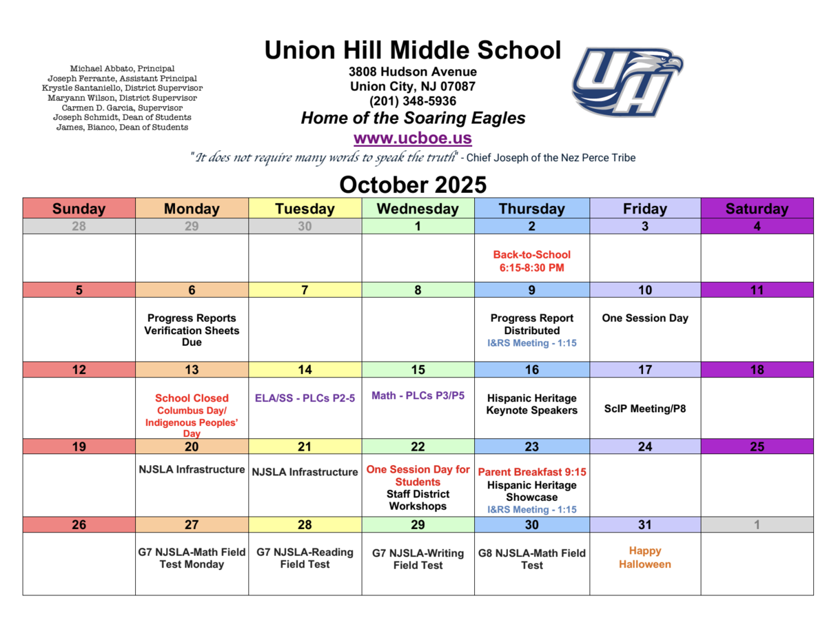 ”Feliz mes de octubre! Aquà estÔn las últimas noticias e información sobre los próximos eventos relacionados con la Escuela Intermedia de Union Hill. Por favor, dedique un momento a revisar nuestro calendario de octubre de 2025.