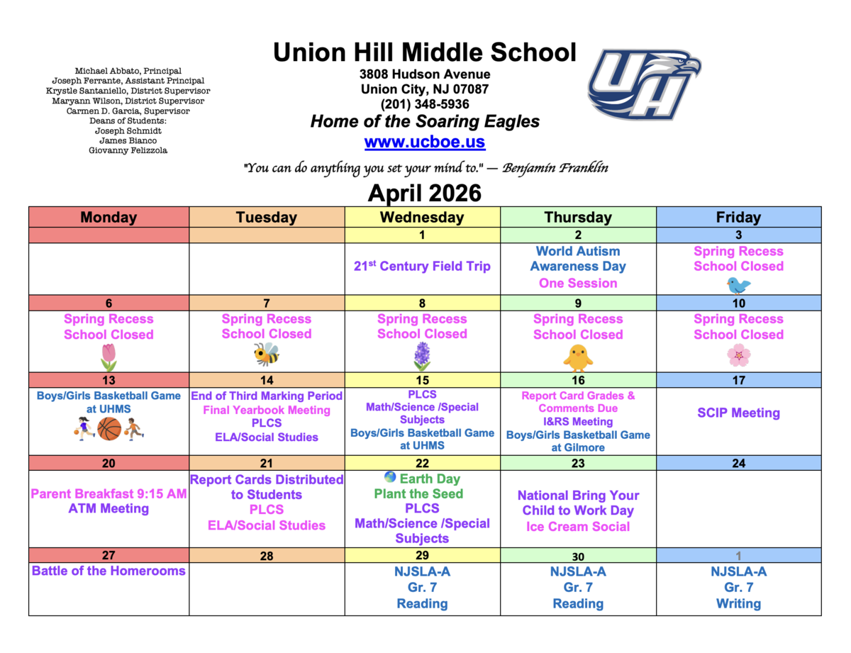 A continuación, les ofrecemos las últimas noticias e información sobre los próximos eventos relacionados con la Escuela Intermedia de Union Hill. Les rogamos que dediquen unos minutos a consultar nuestro calendario de abril de 2026.